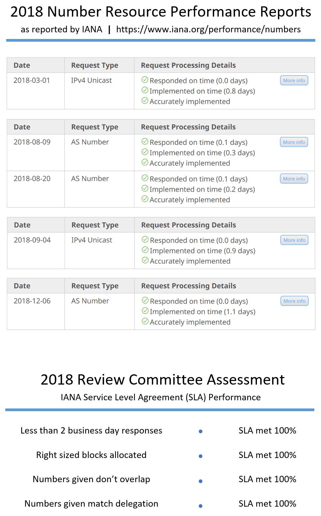 The Regional Internet Registry (RIR) staff have reviewed the IANA performance reports for 2018 and confirm that the Service Level Agreements (SLA) were met 100% of the time in all cases. It is noted that the IPv4 unicast requests in March and September were automatic allocations made to the RIRs in accordance with the Global Policy for Post Exhaustion IPv4 Allocation Mechanisms by the IANA. These allocations were executed as expected with no issues to note. The three AS number requests submitted during the months of August and December fully met the expectations of the RIRs and were executed within the agreed to terms of our SLA with no issues to note. The RIRs recognize the flawless execution of IANA services in 2018.
